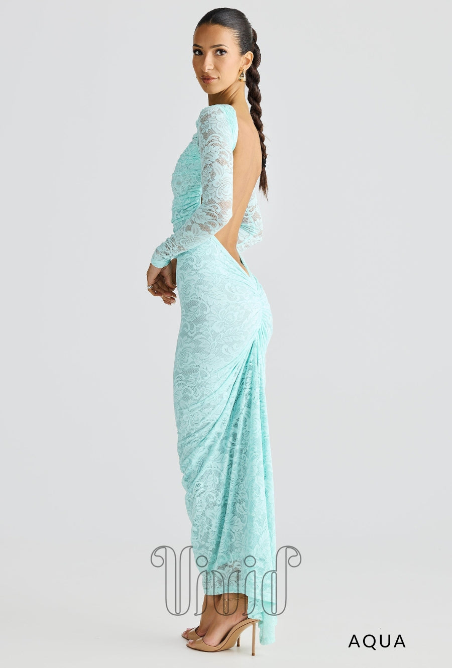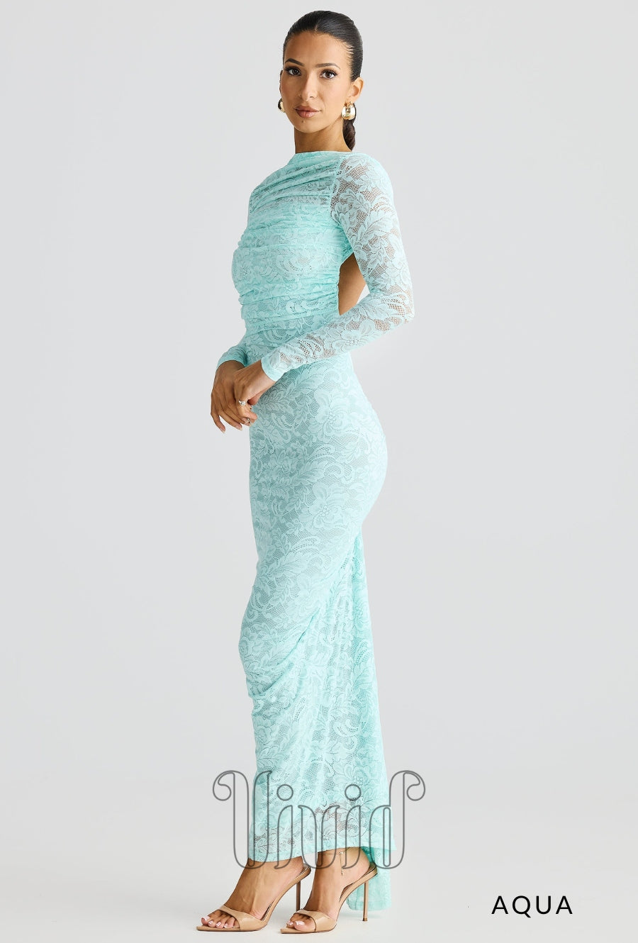 The stunning dress is crafted from a timeless stretch lace and speaks for itself. Classic, timeless, and will be your closet staple for years to come. The dress features a high gathered neckline, statement open back and ruched back detailing.