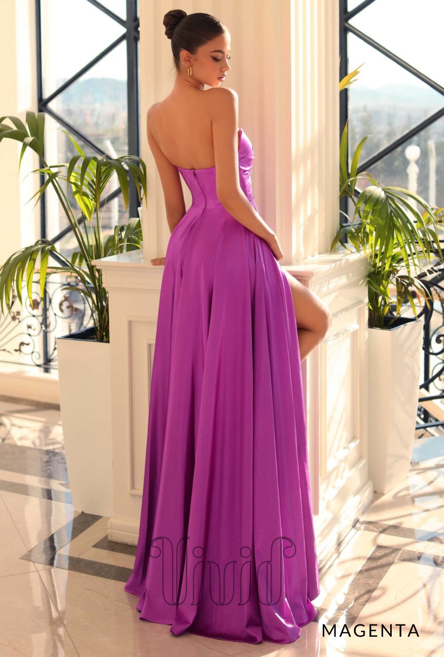 Get ready to turn heads! This stunning gown is crafted out of lush gloss stretch jersey and features a strapless boned bodice with flattering gather detailing and a flowing skirt with front thigh high side split.