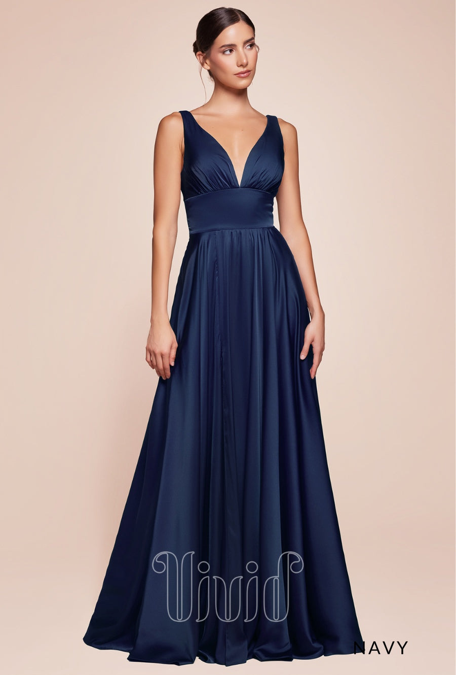 This stunning evening gown is crafted from satin and features a V neckline, fitted waistband and open back. The gown also features a flowing A-line skirt with thigh high front side split.