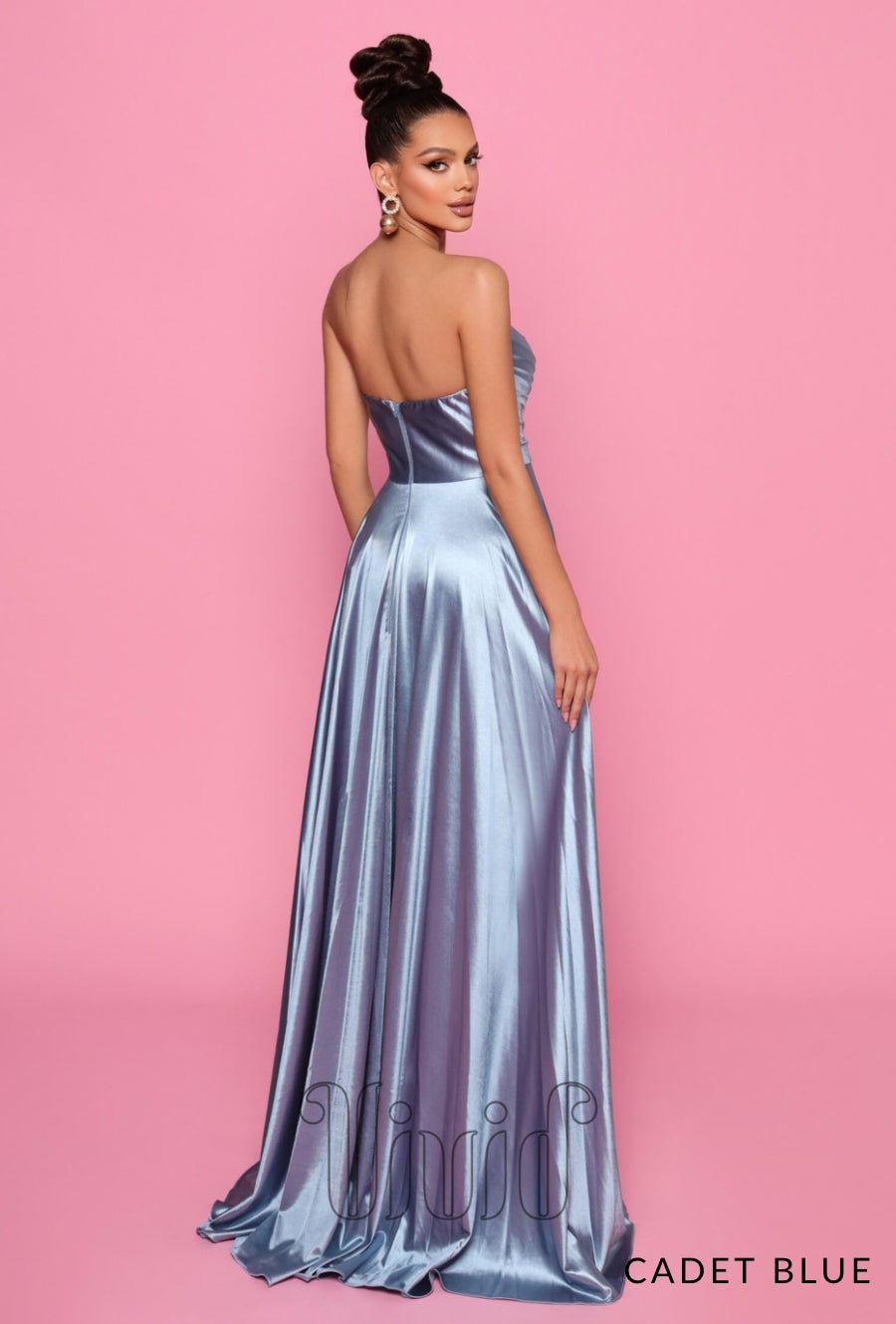 This incredible gown is a serious head turner! This stunning gown is crafted out of lush satin and features a strapless boned bodice with flattering gather detailing and a flowing skirt with front thigh high side split.