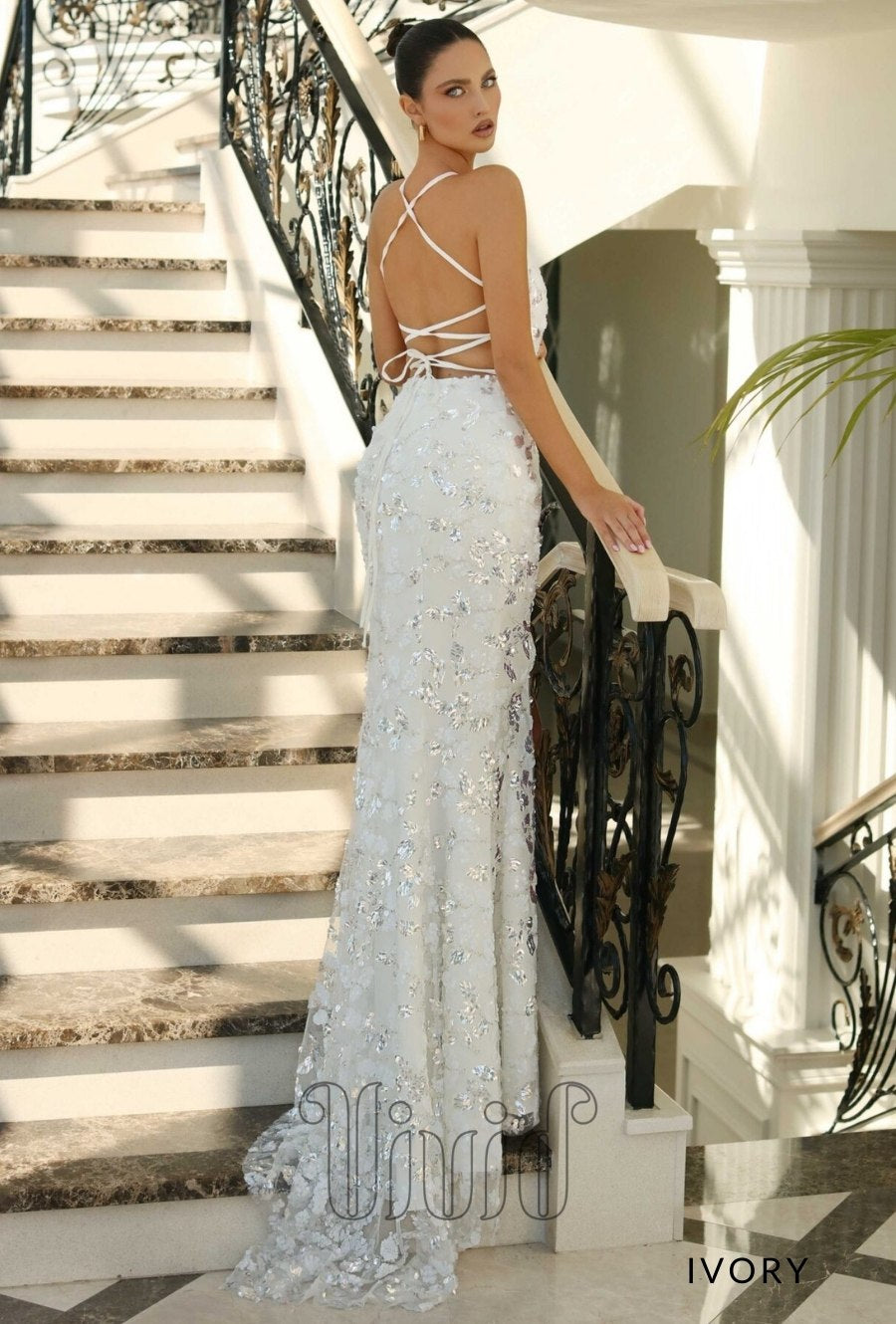 This glamorous evening gown is crafted out of a luxe embellished fabrication and features a V-Neckline with illusion mesh panel, a structured and boned bodice and dramatic open back with tie back detailing. The gown also features a thigh high front side split and small train