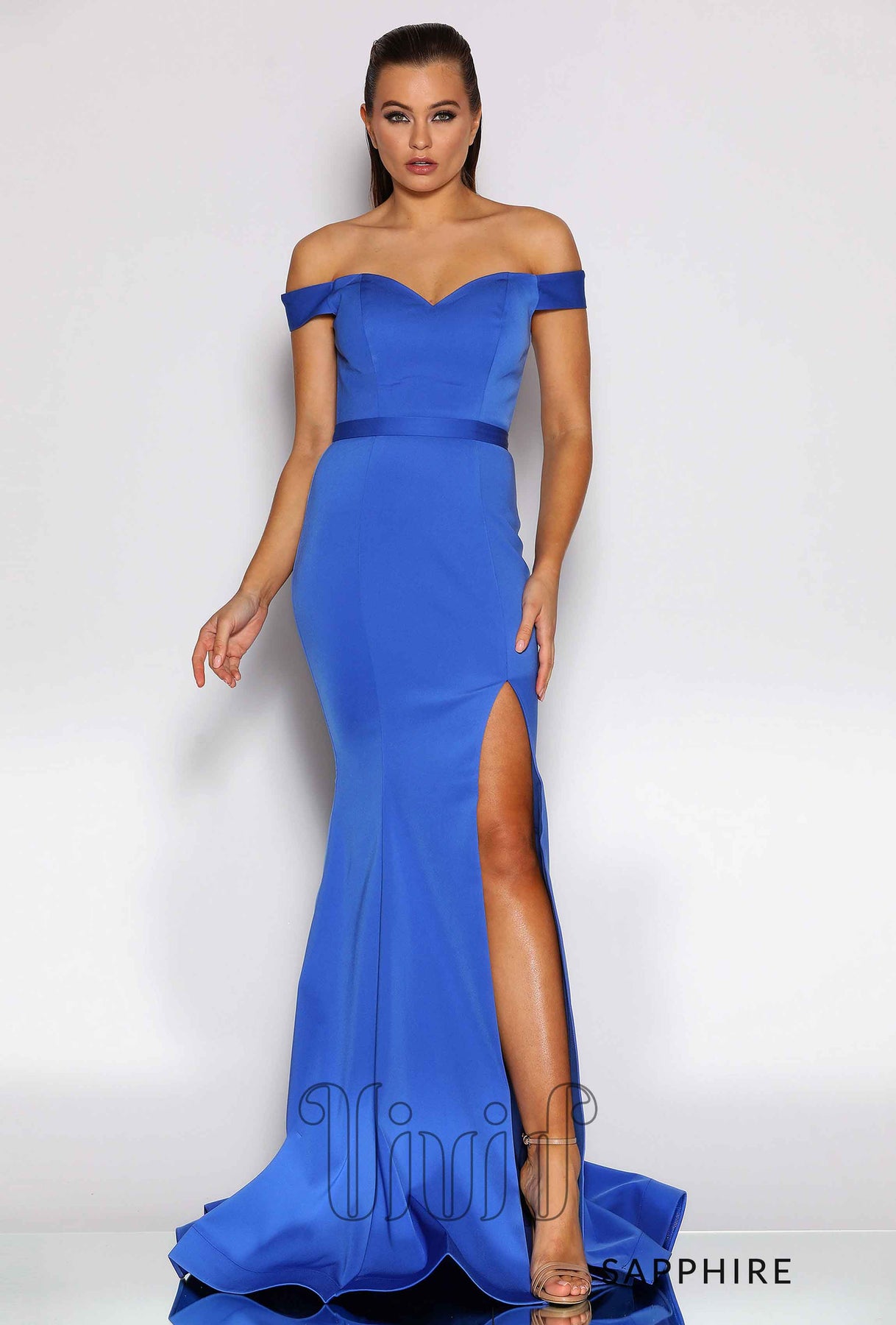 This gorgeous full length fitted evening gown features off the shoulder straps and a fully boned bodice. The bodice makes way for a mermaid style skirt which forms to the figure for a flattering fit. The mermaid silhouette hugs the body in all the right places. A thin waist belt embraces the waist and creates a flattering and slender shape.
