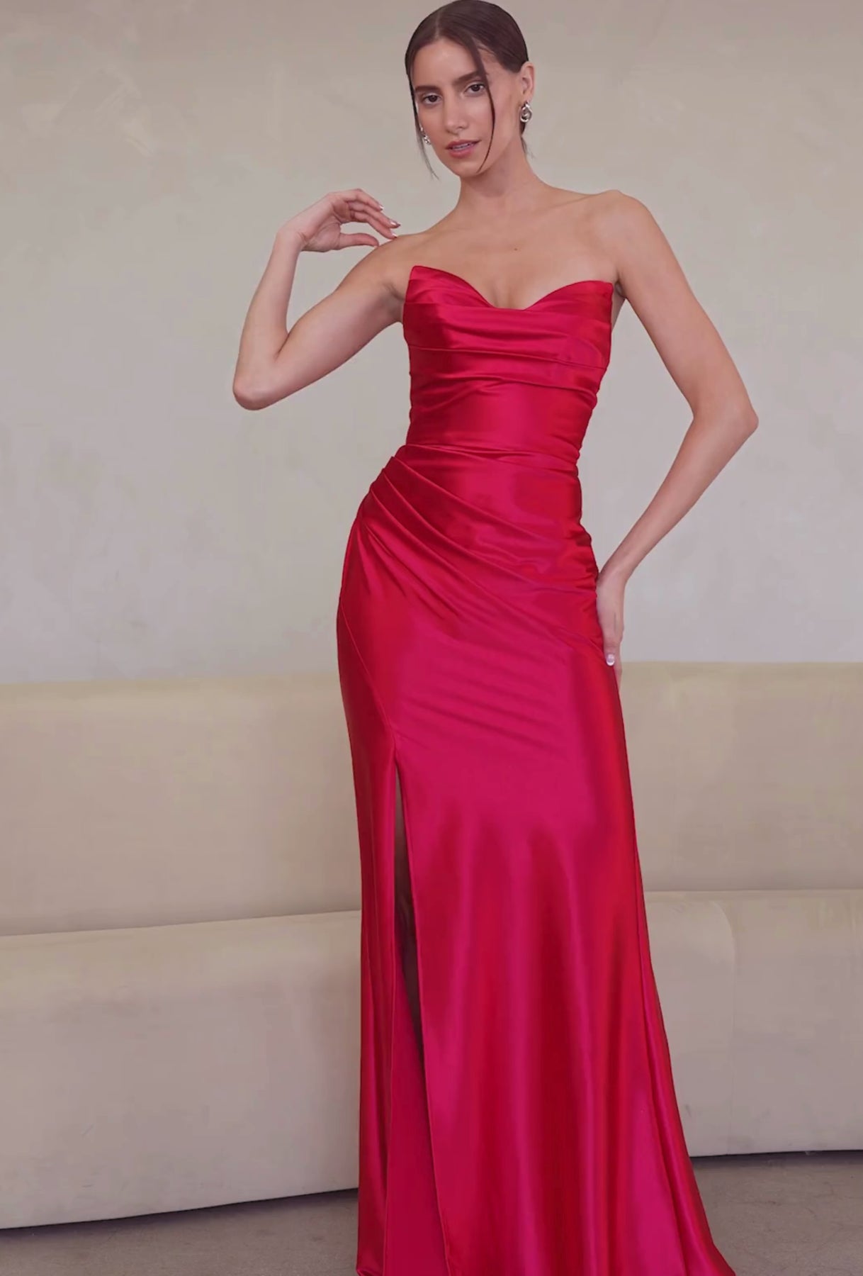 This fitted strapless dress features a flattering V-neckline, with a gathered bodice and hipline that accentuates your natural shape. The soft stretch satin fabric provides comfort, while the leg slit adds a hint of allure. Perfect for attending weddings, as a bridesmaid, or any formal event, this dress ensures you look both elegant and confident.