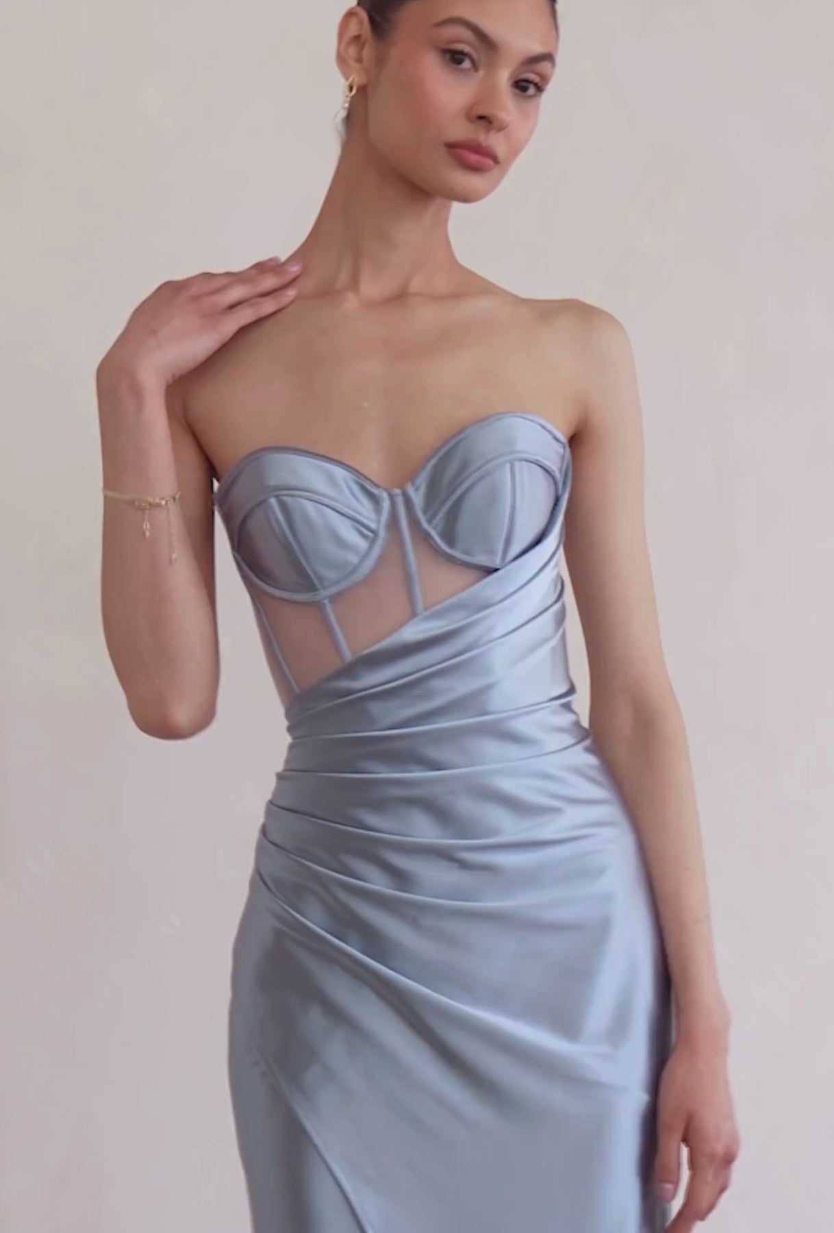 This strapless fitted gown embodies elegance with its sweetheart neckline and expertly structured bodice, designed to highlight your silhouette. The gathered waistline gracefully accentuates your curves, while the leg slit adds a hint of allure. Crafted from soft semi-stretch satin with a lace-up corset back, this gown is a stunning choice for formal or black-tie events.