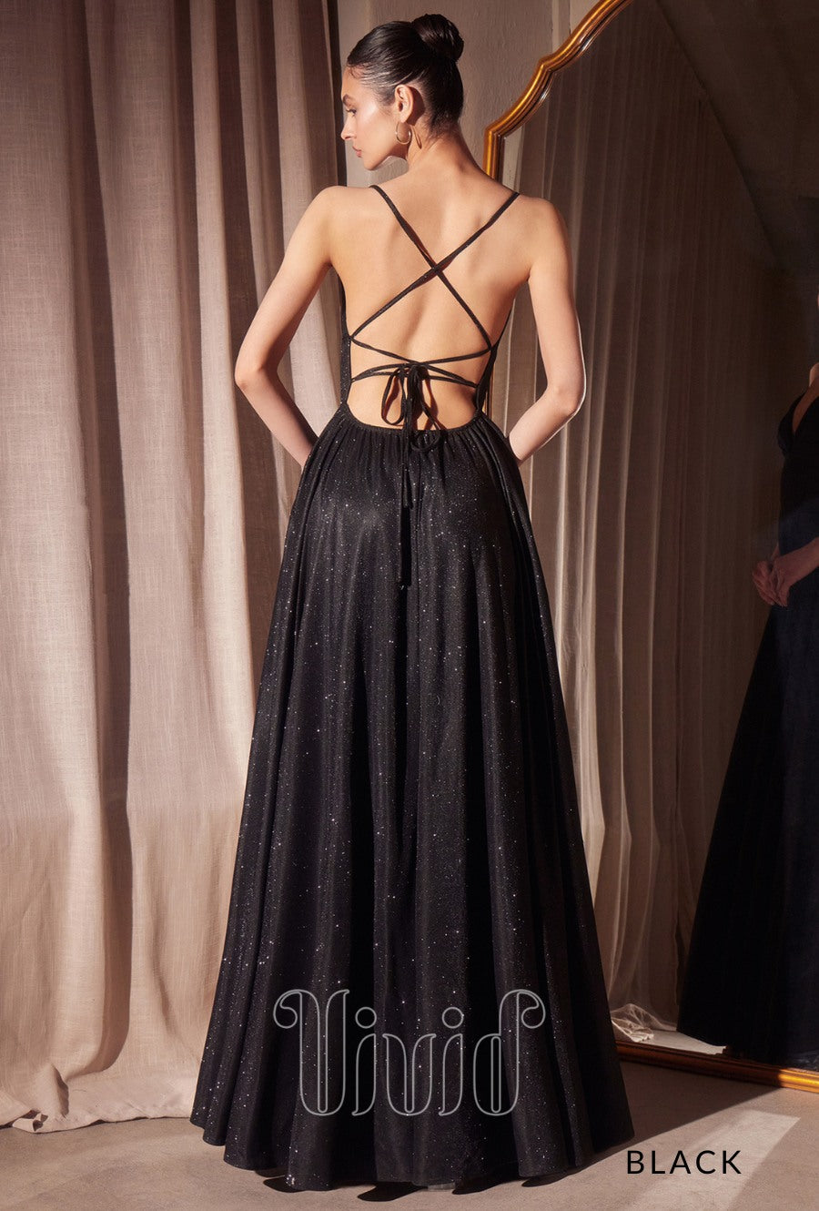 This dazzling A-line gown is a showstopper, designed to turn heads at your next special occasion. Featuring a gathered V-front, this gown exudes effortless elegance. Thin, delicate straps add a touch of modern sophistication, while the open lace-up back creates a stunning, customisable fit. The skirt flows beautifully with every step, enhanced by a daring leg slit for just the right amount of drama. Crafted from glitter-dusted fabric, this gown catches the light from every angle, making it the perfect choice for prom, a gala, or any formal event where you want to shine.